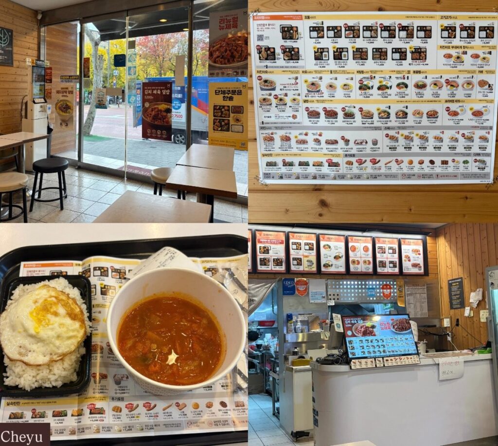 從學校走過去大約 5 分鐘,是一家便宜又好吃的連鎖便當店,大部分的餐點價格都落在 4,000~6,000 韓元之間。選擇很多:泡菜鍋、咖哩飯、炸豬排飯、烤肉飯、豬肉拌飯都有~